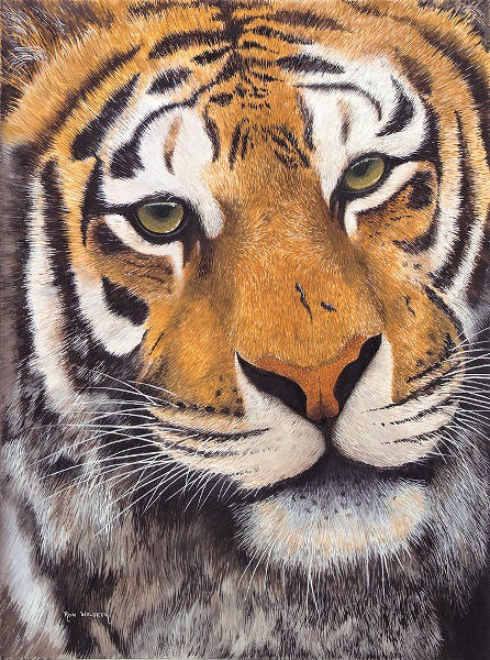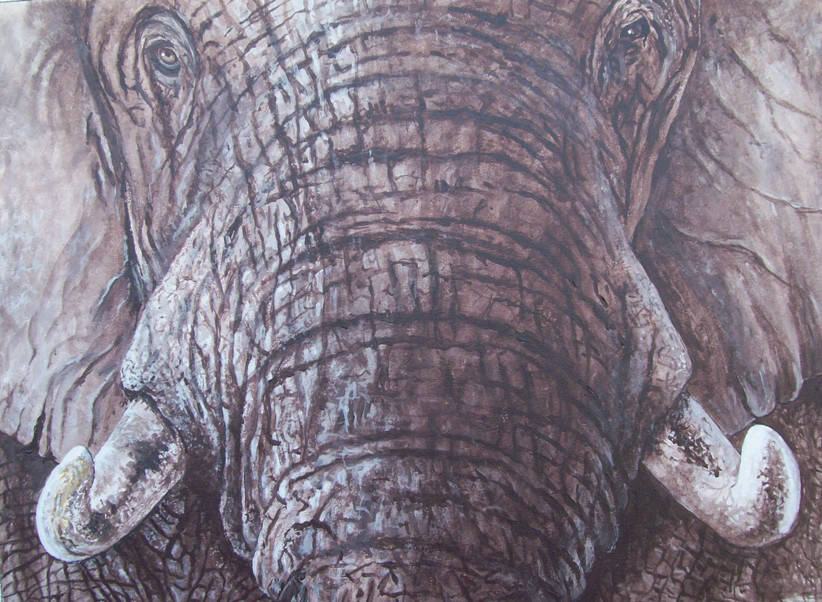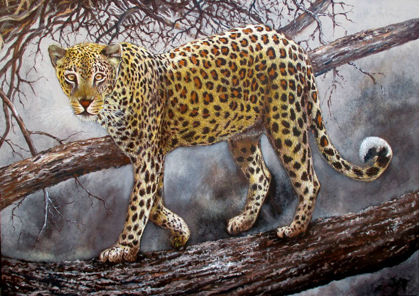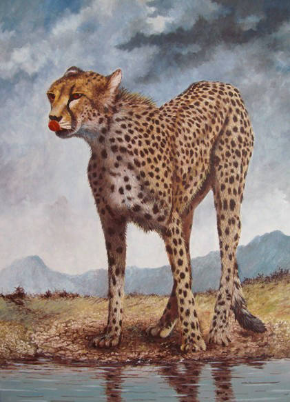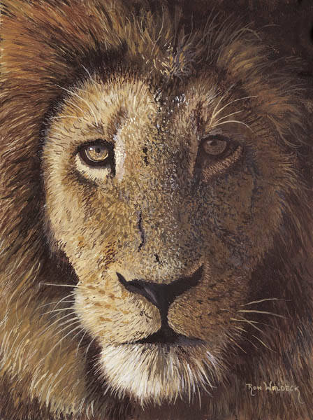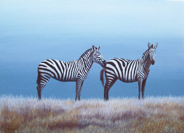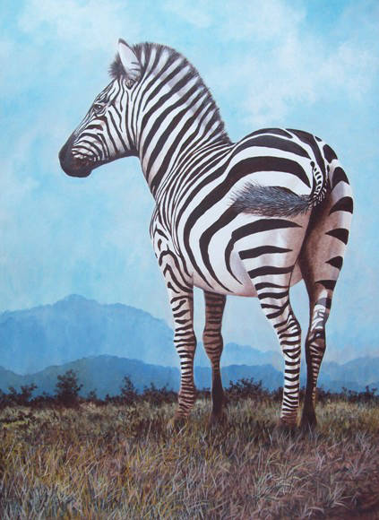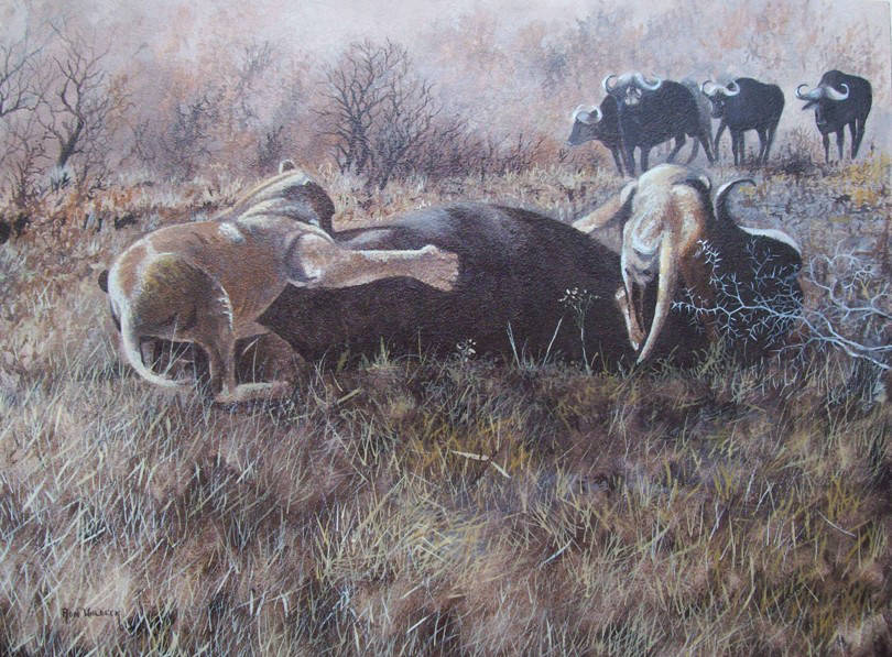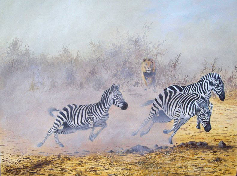 When hunting zebra, lions need all the help they can get, because zebra are very alert animals and move around in groups, this means many pairs of eyes are constantly on the lookout for any signs of danger. In this painting, a male lion was waiting in the bushes, hoping that the zebra would come closer to his ambush spot. The very opposite has happened and they have moved further away, before they are completely out of range he has broken cover and is charging at full speed, they have seen him and are now in a state of panic, running for their lives. It's nice to be an artist, you can create a situation. I like the fact that the zebras are going to escape.