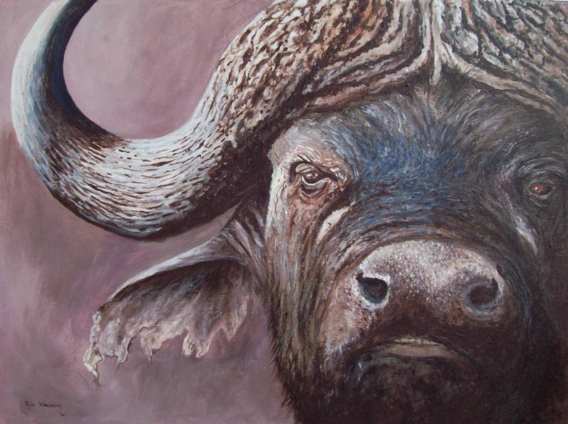 This old Buffalo Bull has been around the block a few times, you can tell by his well-worn appearance. He now spends much of his time taking leisurely mud baths, in the company of a few other old bulls. Grumpy and aggressive, donโt underestimate him, he can still move pretty fast.