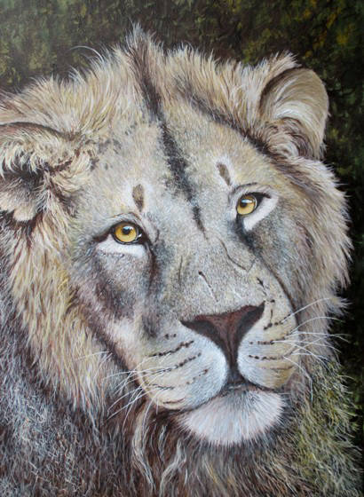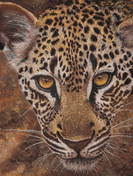 The leopard would look much better if it was painted looking down. I changed the angles, removed the body and now had a leopard looking down, the face was no longer competing with a body background and was far more visible. To make a long story a little shorter I spent a long time on this painting, used the maximum skill I possess and completed what I consider to be the best leopard portrait I have ever done.